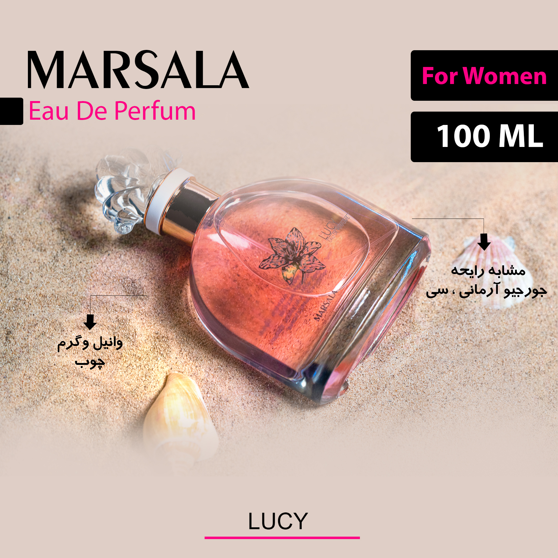 ادپرفیوم زنانه LUCY رایحه مشابه ادکلن Giorgio Armani Si است که در حجم 100 میل توسط برند مارسالا در بازار عرضه شده است. با داشتن رایحه ای مدیترانه ای مناسب برای روزهای خنک پاییزی می باشد . رایحه گرم و شیرین این محصول زنانه حس وقار ، حلاوت و جذابیت خاصی به خانم ها می بخشد. این عطر با ماندگاری بسیار بالا و پخش بوی عالی فراموش نشدنی ، محرک و فوق العاده جذاب است.