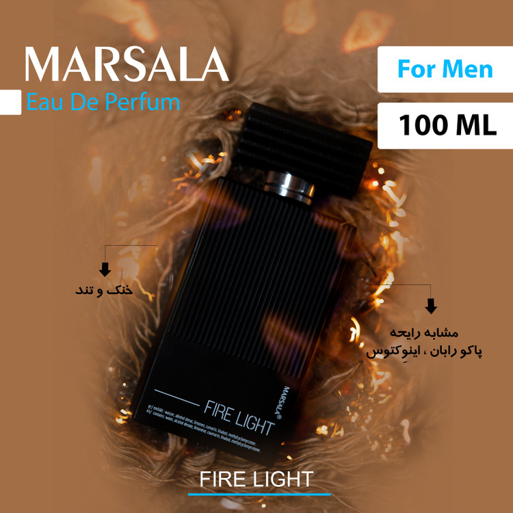 ادوپرفیوم مردانه FIRELIGHT رایحه مشابه ادکلن Paco Rabanne Invictus است که در حجم 100 میل توسط برند مارسالا در بازار عرضه شده است .