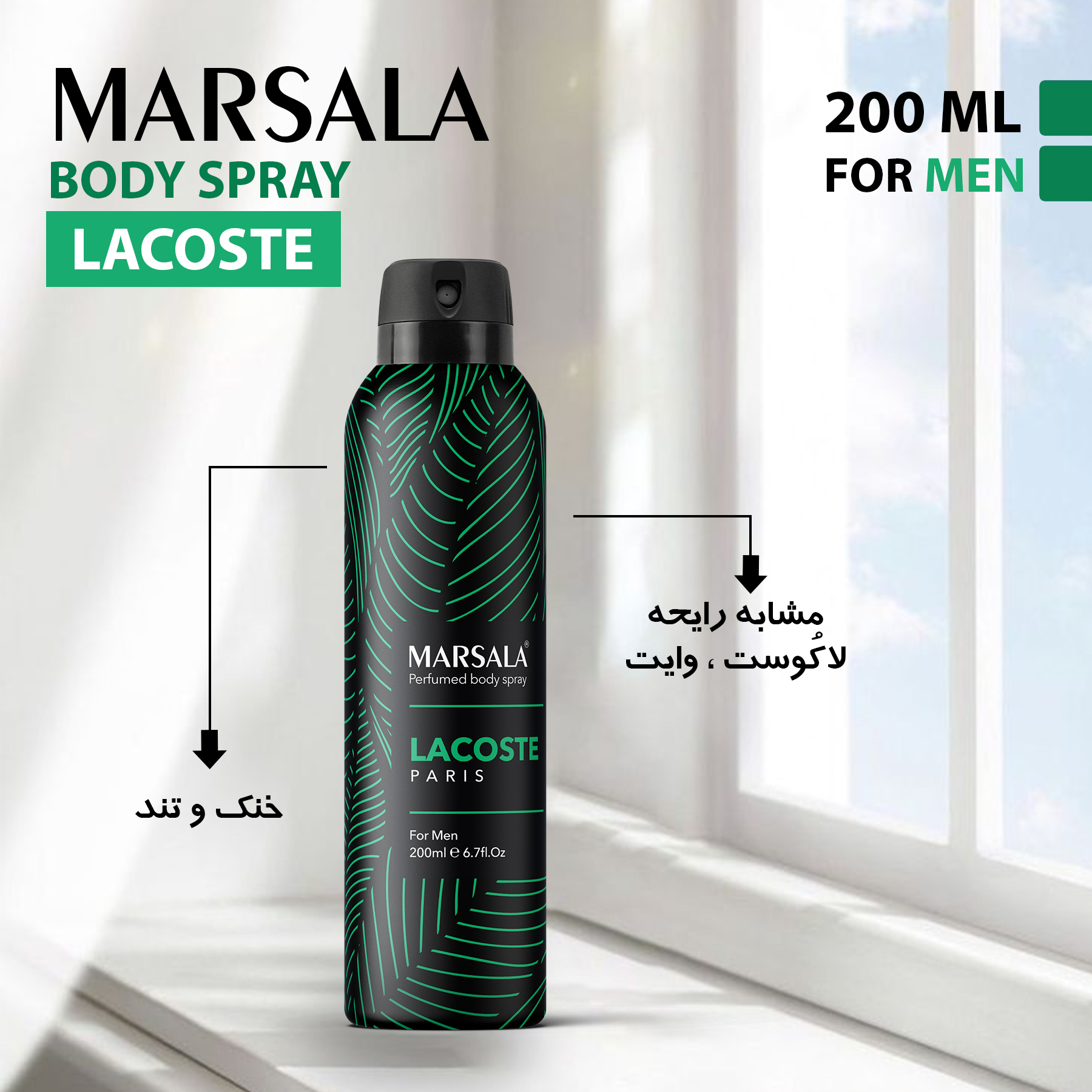 محصول فوق اسپری بدن مردانه مارسالا با رایحه محبوب لاگوست در حجم 200 میل می باشد . نوع رایحه این محصول خنک و تند است .ماندگاری این اسپری 48 ساعت می باشد و میتوان حتی بعد از گذشت یک روز رایحه آن را روی لباس و بدن احساس کرد . این محصول دارای سری چرخشی بصورت on , off می باشد .