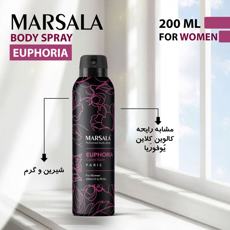 محصول فوق اسپری بدن زنانه مارسالا با رایحه محبوب ایفوریا حجم 200 میل می باشد . نوع رایحه این محصول شیرین و گرم است .ماندگاری این اسپری 48 ساعت می باشد و میتوان حتی بعد از گذشت یک روز رایحه آن را روی لباس و بدن احساس کرد . این محصول دارای سری چرخشی بصورت on , off می باشد .
