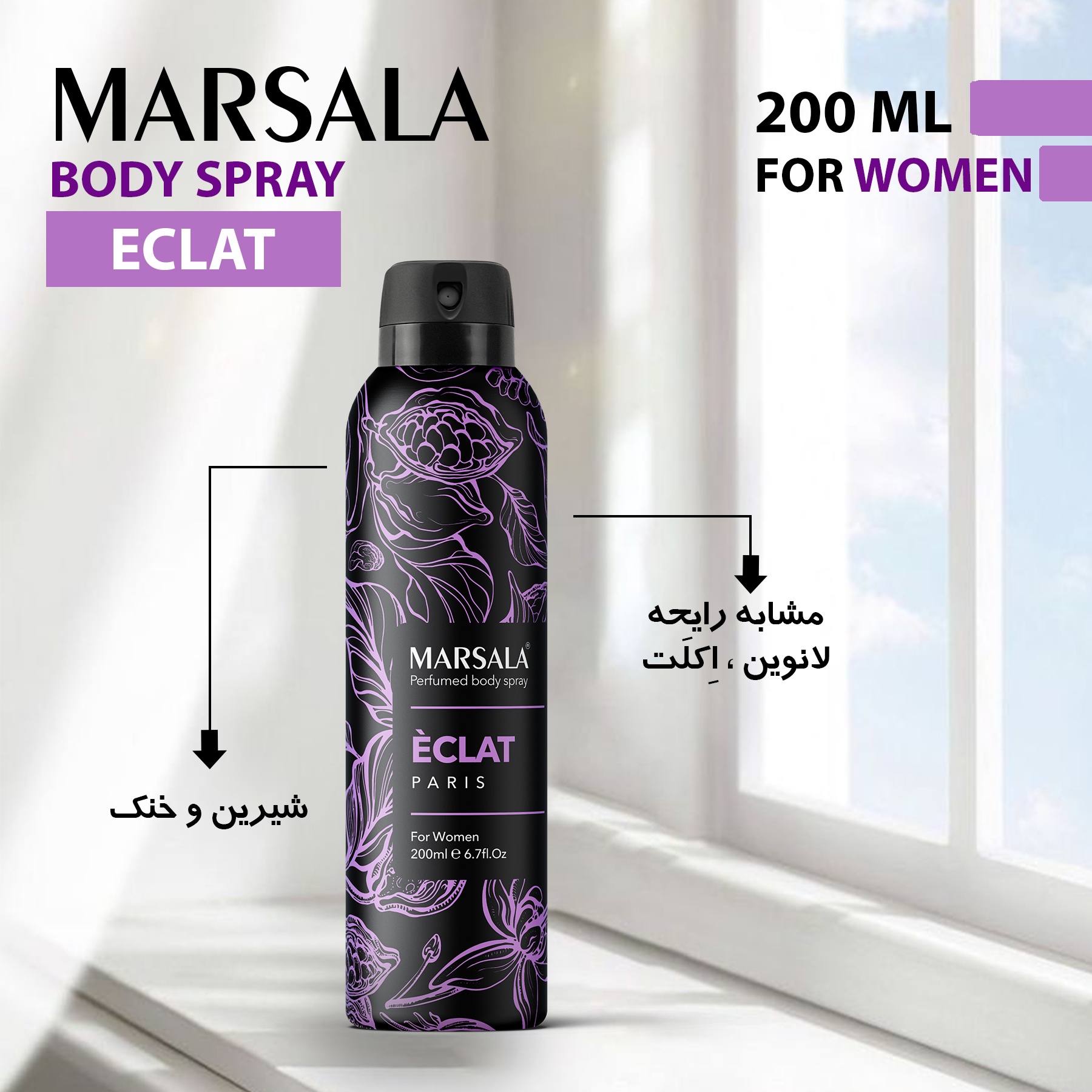 محصول فوق اسپری بدن زنانه مارسالا با رایحه محبوب اکلت حجم 200 میل می باشد . نوع رایحه این محصول شیرین و خنک است .ماندگاری این اسپری 48 ساعت می باشد و میتوان حتی بعد از گذشت یک روز رایحه آن را روی لباس و بدن احساس کرد . این محصول دارای سری چرخشی بصورت on , off می باشد .
