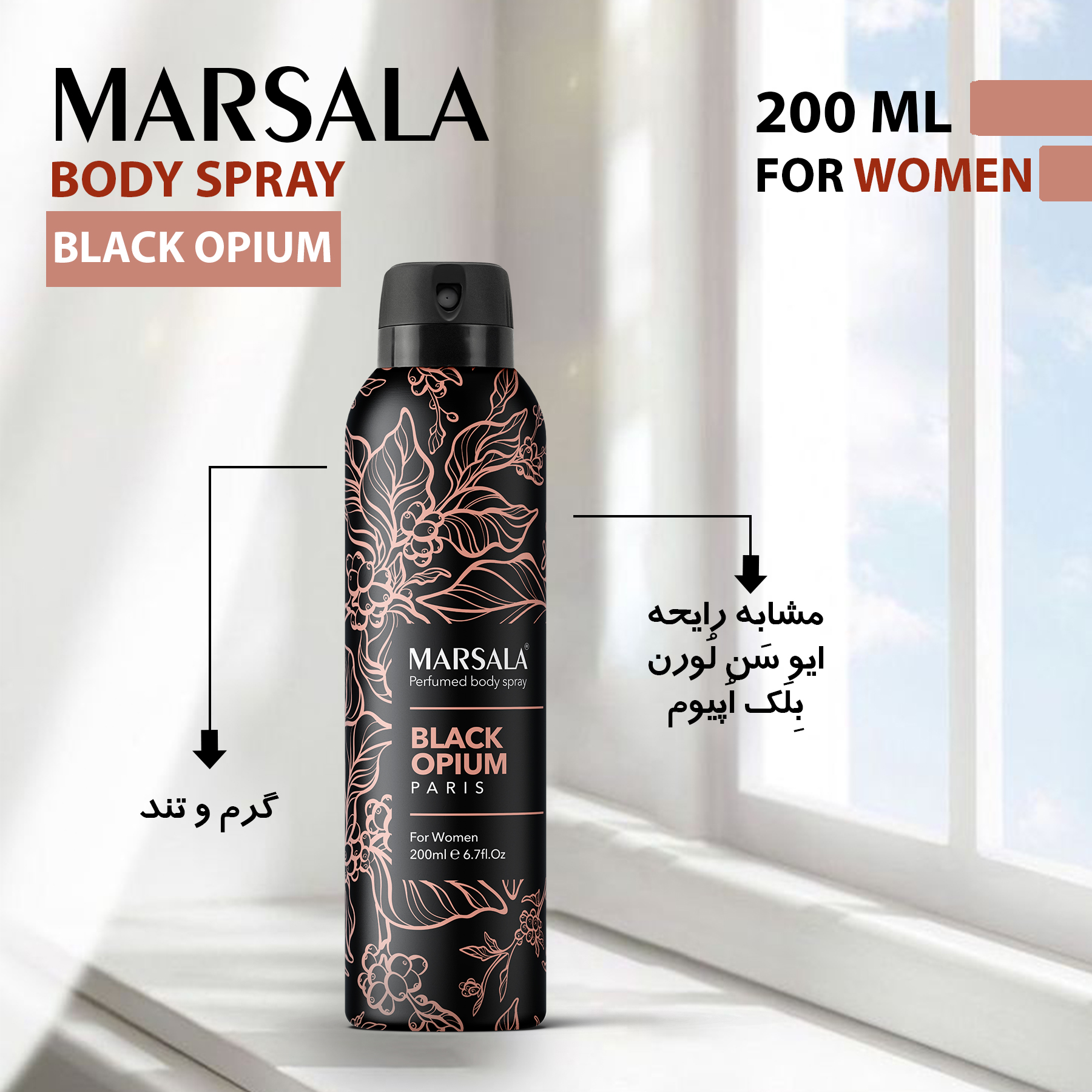 محصول فوق اسپری بدن زنانه مارسالا با رایحه محبوب بلک اوپیوم حجم 200 میل می باشد . نوع رایحه این محصول گرم و تند است .ماندگاری این اسپری 48 ساعت می باشد و میتوان حتی بعد از گذشت یک روز رایحه آن را روی لباس و بدن احساس کرد . این محصول دارای سری چرخشی بصورت on , off می باشد .