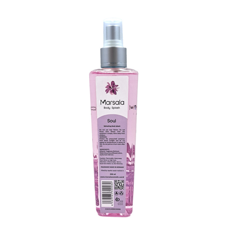بادی اسپلش زنانه SOUL رایحه مشابه ادکلن Lancome Tresor Midnight Rose است که در حجم 250 میل توسط برند مارسالا در بازار عرضه شده است که با داشتن رایحه گلدار مشک چوبی محصولی مناسب برای شب های سرد سال و یا میهمانی های شبانه می باشد . همچنین رایحه اولیه شیرین و خنک رازبری و گل سرخ بلغاری ترکیب بی نظیری است که در کنار رایحه گل یاس فلفل قرمز مشک و چندین رایحه دیگر یک نمونه منحصر به فرد را در این عطر ایجاد کرده
