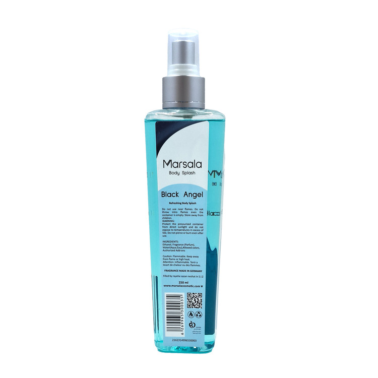 بادی اسپلش زنانه BLACK ANGEL رایحه مشابه ادکلن Dior( Midnight Poison) است که در حجم 250 میل توسط برند مارسالا در بازار عرضه شده است . از ویژگی های جالب توجه این محصول ، ته مایه خفیفی از رایحه ای مردانه است . این محصول الزامی است برای آنان که می خواهند از نهایت قدرت زنانه و جذابیت خود برای شکار استفاده کنند . بالغ ، کامل و مدرن .