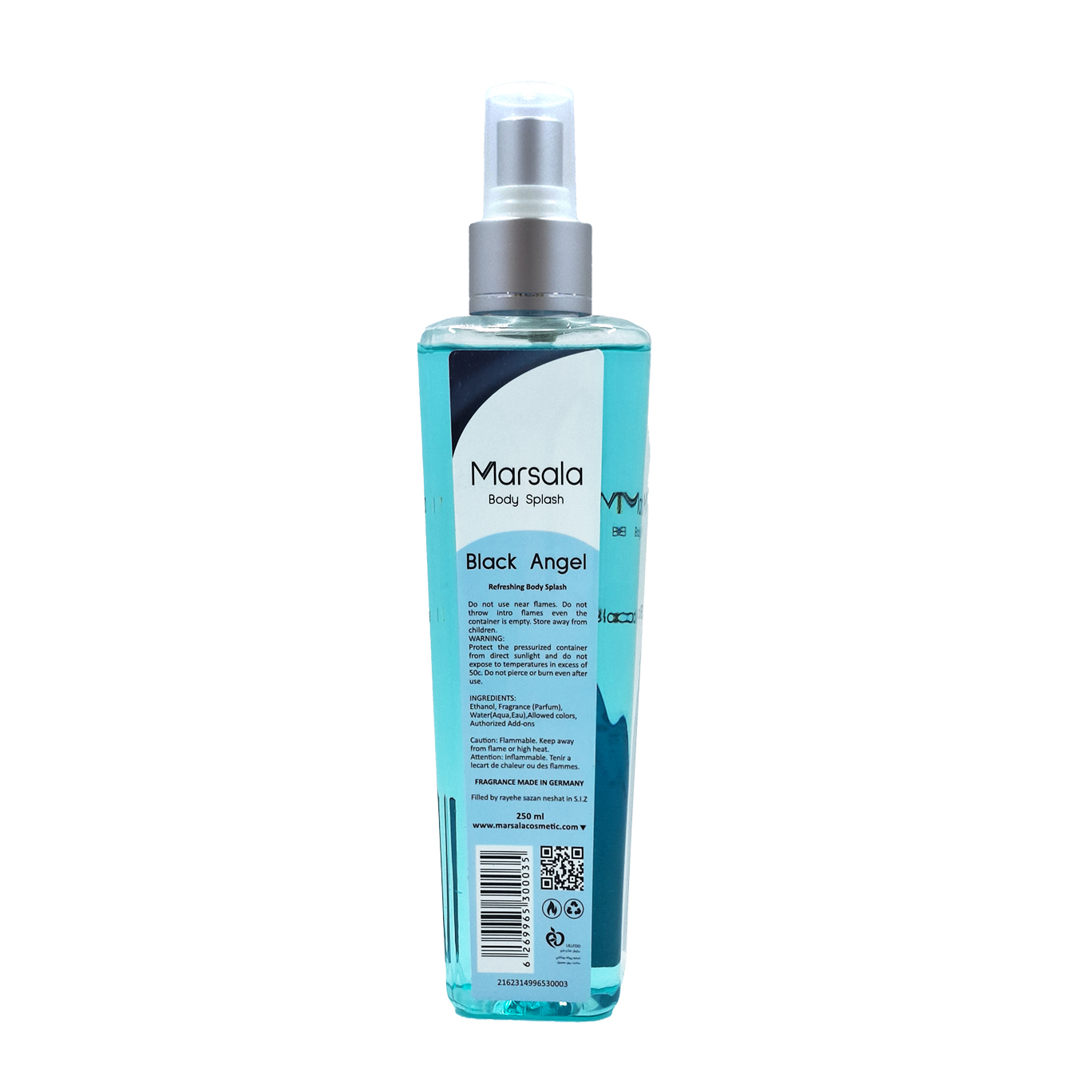 بادی اسپلش زنانه BLACK ANGEL رایحه مشابه ادکلن Dior( Midnight Poison) است که در حجم 250 میل توسط برند مارسالا در بازار عرضه شده است . از ویژگی های جالب توجه این محصول ، ته مایه خفیفی از رایحه ای مردانه است . این محصول الزامی است برای آنان که می خواهند از نهایت قدرت زنانه و جذابیت خود برای شکار استفاده کنند . بالغ ، کامل و مدرن .